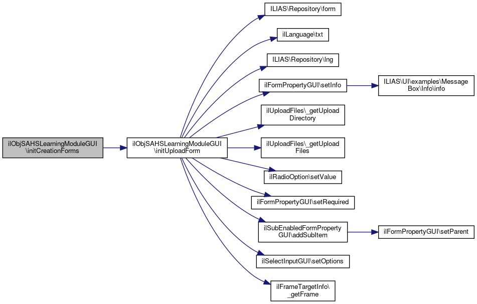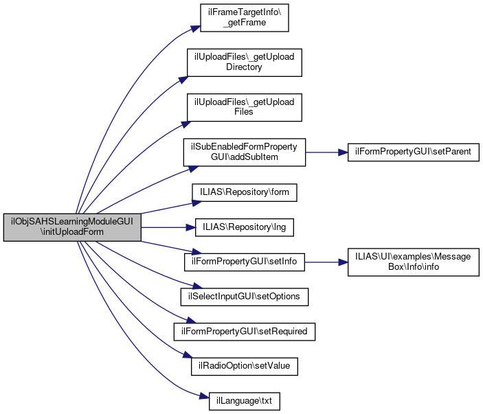 Here is the call graph for this function:| ilObjSAHSLearningModuleGUI::initUploadForm | ( | ) |
