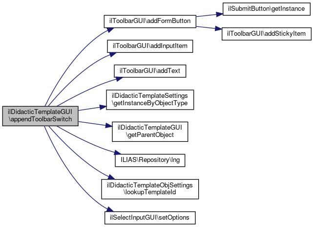 Here is the call graph for this function:| ilDidacticTemplateGUI::appendToolbarSwitch | ( | ilToolbarGUI | $toolbar, |