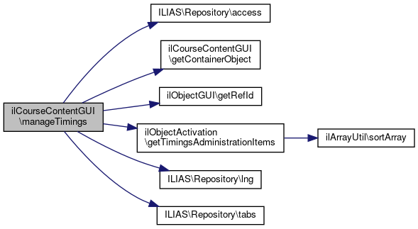 References ILIAS\Repository\access(), getContainerObject(), ilObjectGUI\getRefId(), ilObjectActivation\getTimingsAdministrationItems(), ILIAS\Repository\lng(), and ILIAS\Repository\tabs().