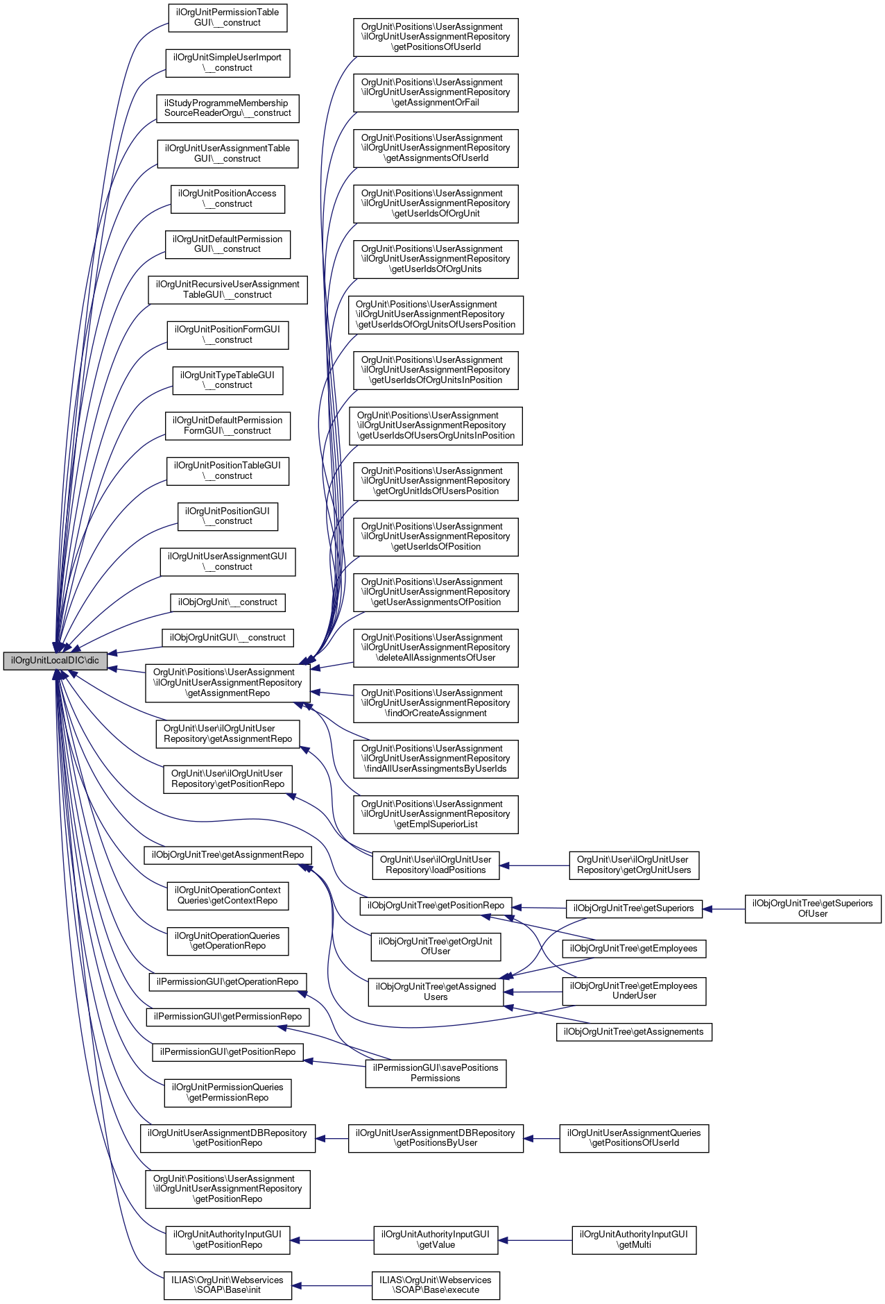 Referenced by ilOrgUnitPermissionTableGUI\__construct(), ilOrgUnitSimpleUserImport\__construct(), ilStudyProgrammeMembershipSourceReaderOrgu\__construct(), ilOrgUnitUserAssignmentTableGUI\__construct(), ilOrgUnitPositionAccess\__construct(), ilOrgUnitDefaultPermissionGUI\__construct(), ilOrgUnitRecursiveUserAssignmentTableGUI\__construct(), ilOrgUnitPositionFormGUI\__construct(), ilOrgUnitTypeTableGUI\__construct(), ilOrgUnitDefaultPermissionFormGUI\__construct(), ilOrgUnitPositionTableGUI\__construct(), ilOrgUnitPositionGUI\__construct(), ilOrgUnitUserAssignmentGUI\__construct(), ilObjOrgUnit\__construct(), ilObjOrgUnitGUI\__construct(), OrgUnit\Positions\UserAssignment\ilOrgUnitUserAssignmentRepository\getAssignmentRepo(), OrgUnit\User\ilOrgUnitUserRepository\getAssignmentRepo(), ilObjOrgUnitTree\getAssignmentRepo(), ilOrgUnitOperationContextQueries\getContextRepo(), ilOrgUnitOperationQueries\getOperationRepo(), ilPermissionGUI\getOperationRepo(), ilOrgUnitPermissionQueries\getPermissionRepo(), ilPermissionGUI\getPermissionRepo(), ilOrgUnitUserAssignmentDBRepository\getPositionRepo(), OrgUnit\Positions\UserAssignment\ilOrgUnitUserAssignmentRepository\getPositionRepo(), ilOrgUnitAuthorityInputGUI\getPositionRepo(), OrgUnit\User\ilOrgUnitUserRepository\getPositionRepo(), ilPermissionGUI\getPositionRepo(), ilObjOrgUnitTree\getPositionRepo(), and ILIAS\OrgUnit\Webservices\SOAP\Base\init().