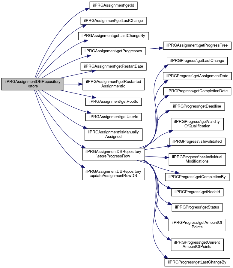 Here is the call graph for this function:| ilPRGAssignmentDBRepository::store | ( | ilPRGAssignment | $assignment | ) |