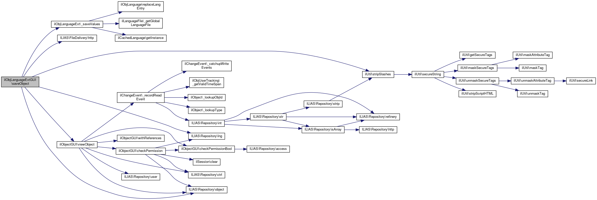 Here is the call graph for this function:| ilObjLanguageExtGUI::saveSettingsObject | ( | ) |