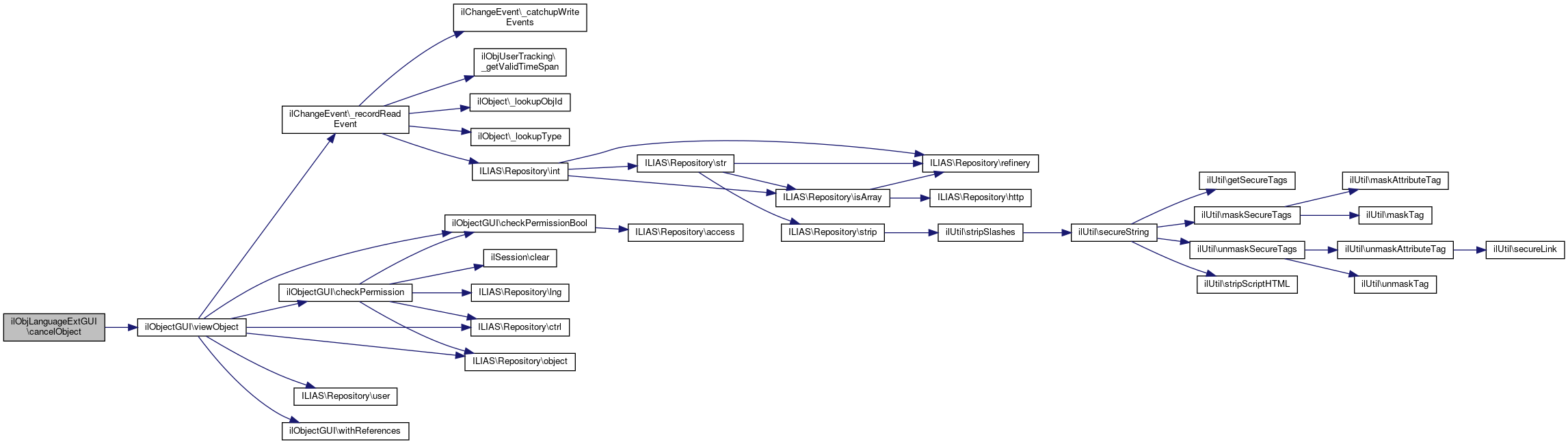 Here is the caller graph for this function:| ilObjLanguageExtGUI::cancelObject | ( | ) |