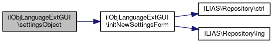 Here is the call graph for this function:| ilObjLanguageExtGUI::settingsObject | ( | ) |