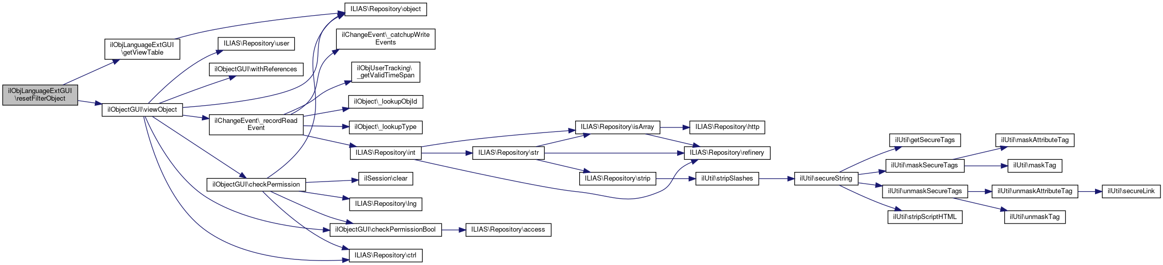 Here is the call graph for this function:| ilObjLanguageExtGUI::resetFilterObject | ( | ) |