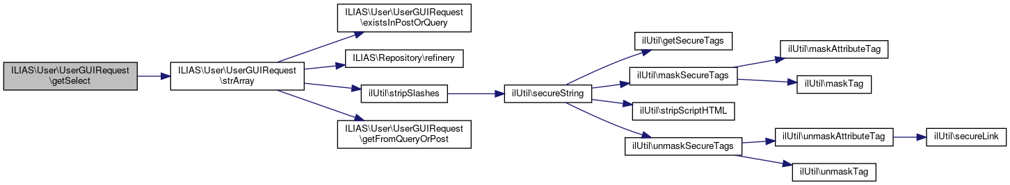 Here is the call graph for this function:| ILIAS\User\UserGUIRequest::getSelect | ( | ) |
