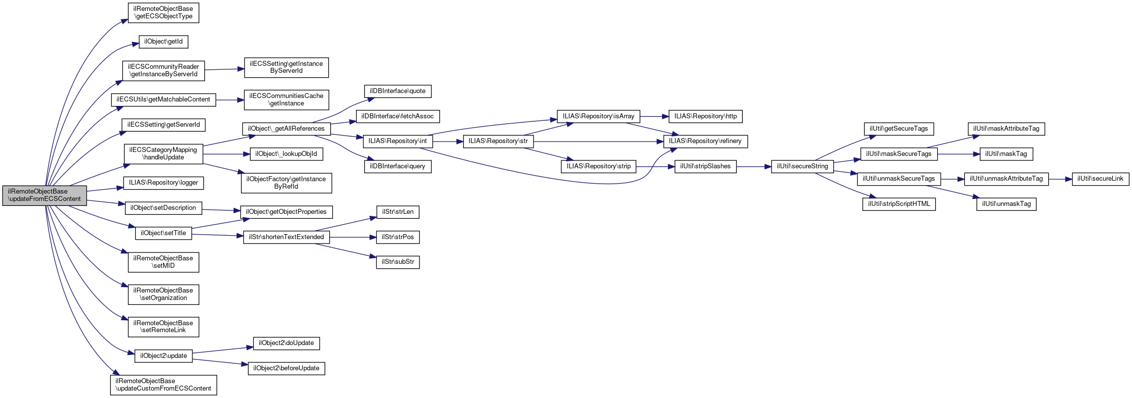 References getECSObjectType(), ilObject\getId(), ilECSCommunityReader\getInstanceByServerId(), ilECSUtils\getMatchableContent(), ilECSSetting\getServerId(), ilECSCategoryMapping\handleUpdate(), ILIAS\Repository\logger(), ilObject\setDescription(), setMID(), setOrganization(), setRemoteLink(), ilObject\setTitle(), ilObject2\update(), and updateCustomFromECSContent().