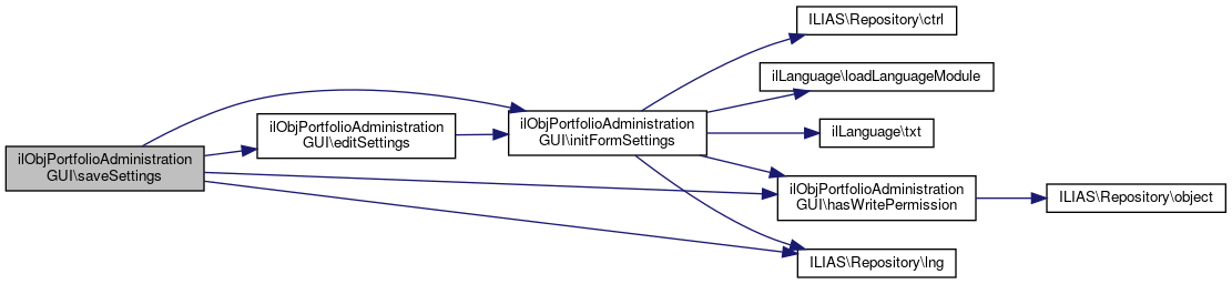 Here is the call graph for this function:| ilObjPortfolioAdministrationGUI::saveSettings | ( | ) |