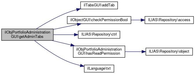 Here is the call graph for this function:| ilObjPortfolioAdministrationGUI::getAdminTabs | ( | ) |