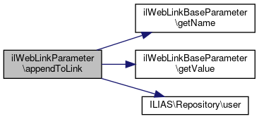 Here is the call graph for this function:| ilWebLinkParameter::appendToLink | ( | string | $link | ) |