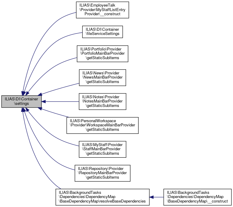 Referenced by ILIAS\EmployeeTalk\Provider\MyStaffListEntryProvider\__construct(), ILIAS\DI\Container\fileServiceSettings(), ILIAS\Portfolio\Provider\PortfolioMainBarProvider\getStaticSubItems(), ILIAS\News\Provider\NewsMainBarProvider\getStaticSubItems(), ILIAS\Notes\Provider\NotesMainBarProvider\getStaticSubItems(), ILIAS\PersonalWorkspace\Provider\WorkspaceMainBarProvider\getStaticSubItems(), ILIAS\MyStaff\Provider\StaffMainBarProvider\getStaticSubItems(), ILIAS\Repository\Provider\RepositoryMainBarProvider\getStaticSubItems(), and ILIAS\BackgroundTasks\Dependencies\DependencyMap\BaseDependencyMap\resolveBaseDependencies().