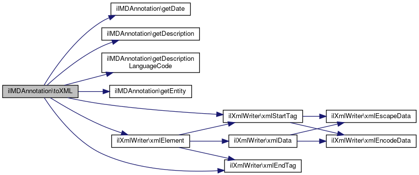 Here is the caller graph for this function:| ilMDAnnotation::toXML | ( | ilXmlWriter | $writer | ) |