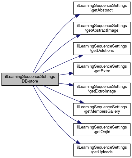 References ilLearningSequenceSettings\getAbstract(), ilLearningSequenceSettings\getAbstractImage(), ilLearningSequenceSettings\getDeletions(), ilLearningSequenceSettings\getExtro(), ilLearningSequenceSettings\getExtroImage(), ilLearningSequenceSettings\getMembersGallery(), ilLearningSequenceSettings\getObjId(), and ilLearningSequenceSettings\getUploads().