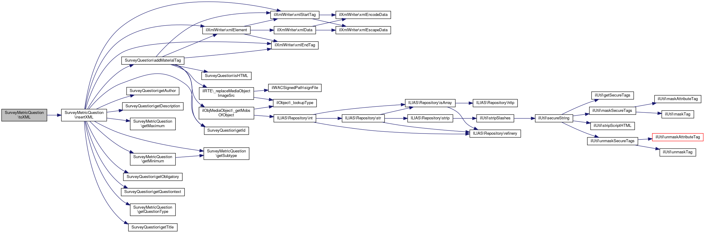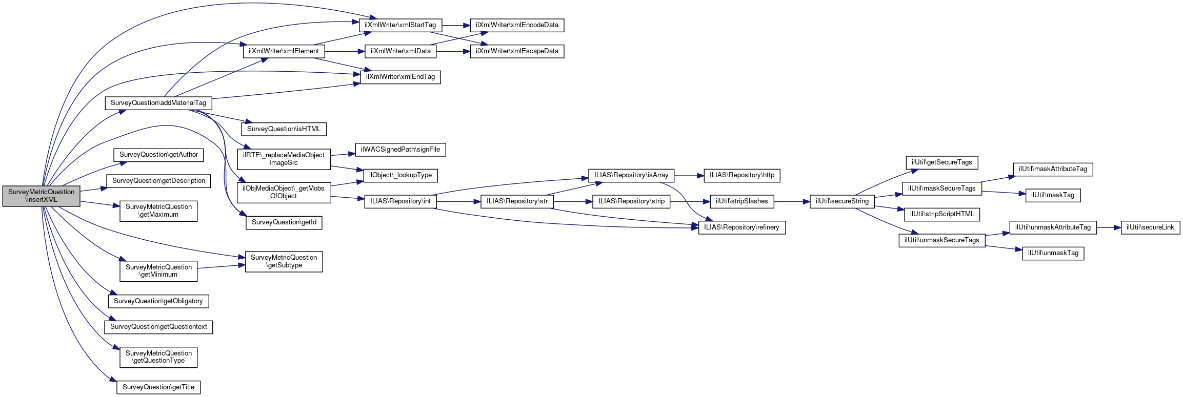 Here is the call graph for this function:| SurveyMetricQuestion::insertXML | ( | ilXmlWriter | $a_xml_writer, |