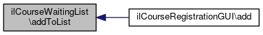 Here is the call graph for this function:| ilCourseWaitingList::addToList | ( | int | $a_usr_id | ) |