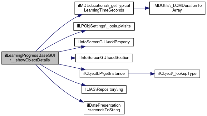 Here is the call graph for this function:| ilLearningProgressBaseGUI::__appendLPDetails | ( | ilInfoScreenGUI | $info, |