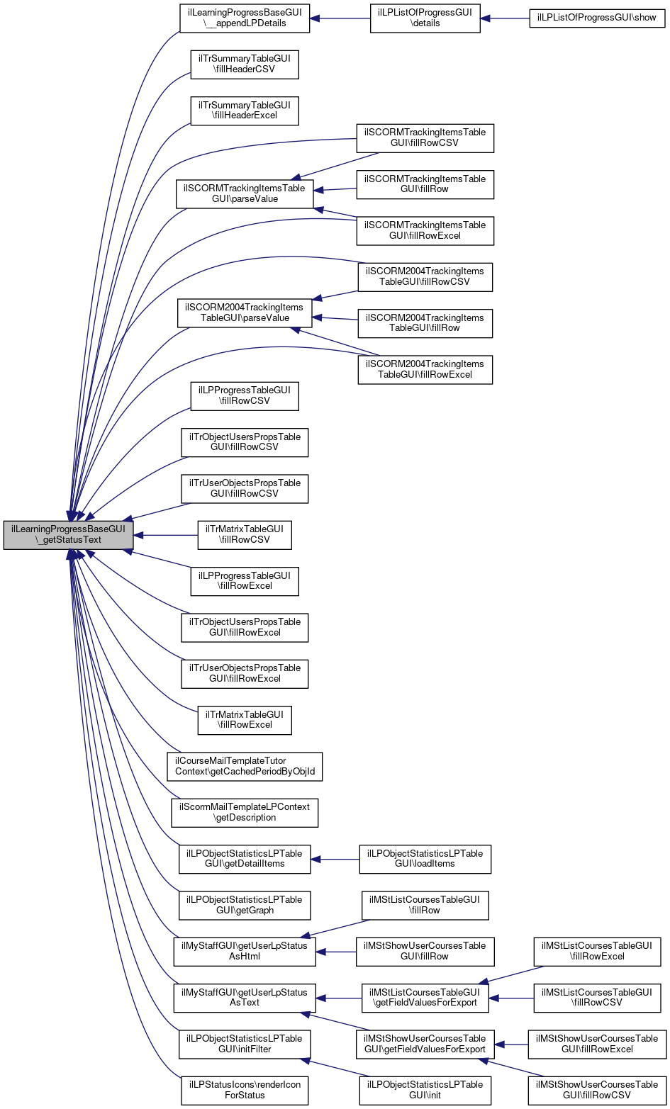 Referenced by __appendLPDetails(), ilTrSummaryTableGUI\fillHeaderCSV(), ilTrSummaryTableGUI\fillHeaderExcel(), ilSCORMTrackingItemsTableGUI\fillRowCSV(), ilSCORM2004TrackingItemsTableGUI\fillRowCSV(), ilLPProgressTableGUI\fillRowCSV(), ilTrObjectUsersPropsTableGUI\fillRowCSV(), ilTrUserObjectsPropsTableGUI\fillRowCSV(), ilTrMatrixTableGUI\fillRowCSV(), ilSCORMTrackingItemsTableGUI\fillRowExcel(), ilSCORM2004TrackingItemsTableGUI\fillRowExcel(), ilLPProgressTableGUI\fillRowExcel(), ilTrObjectUsersPropsTableGUI\fillRowExcel(), ilTrUserObjectsPropsTableGUI\fillRowExcel(), ilTrMatrixTableGUI\fillRowExcel(), ilCourseMailTemplateTutorContext\getCachedPeriodByObjId(), ilScormMailTemplateLPContext\getDescription(), ilLPObjectStatisticsLPTableGUI\getDetailItems(), ilLPObjectStatisticsLPTableGUI\getGraph(), ilMyStaffGUI\getUserLpStatusAsHtml(), ilMyStaffGUI\getUserLpStatusAsText(), ilLPObjectStatisticsLPTableGUI\initFilter(), ilSCORMTrackingItemsTableGUI\parseValue(), ilSCORM2004TrackingItemsTableGUI\parseValue(), and ilLPStatusIcons\renderIconForStatus().