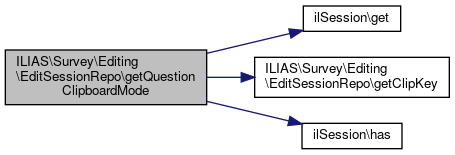 Here is the call graph for this function:| ILIAS\Survey\Editing\EditSessionRepo::getQuestionClipboardMode | ( | int | $ref_id | ) |