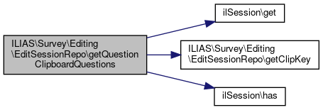 Here is the call graph for this function:| ILIAS\Survey\Editing\EditSessionRepo::getQuestionClipboardQuestions | ( | int | $ref_id | ) |