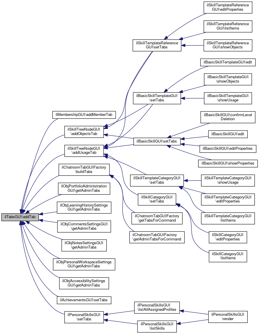 Referenced by ilMembershipGUI\addMemberTab(), ilSkillTreeNodeGUI\addObjectsTab(), ilSkillTreeNodeGUI\addUsageTab(), ilChatroomTabGUIFactory\buildTabs(), ilObjPortfolioAdministrationGUI\getAdminTabs(), ilObjLearningHistorySettingsGUI\getAdminTabs(), ilObjCommentsSettingsGUI\getAdminTabs(), ilObjNotesSettingsGUI\getAdminTabs(), ilObjPersonalWorkspaceSettingsGUI\getAdminTabs(), ilObjAccessibilitySettingsGUI\getAdminTabs(), ilAchievementsGUI\setTabs(), and ilPersonalSkillsGUI\setTabs().