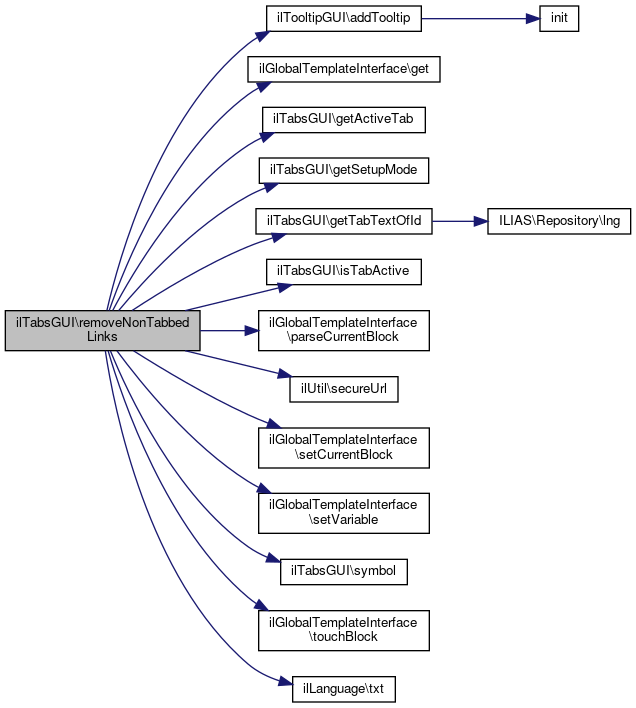 Here is the caller graph for this function:| ilTabsGUI::removeNonTabbedLinks | ( | ) |