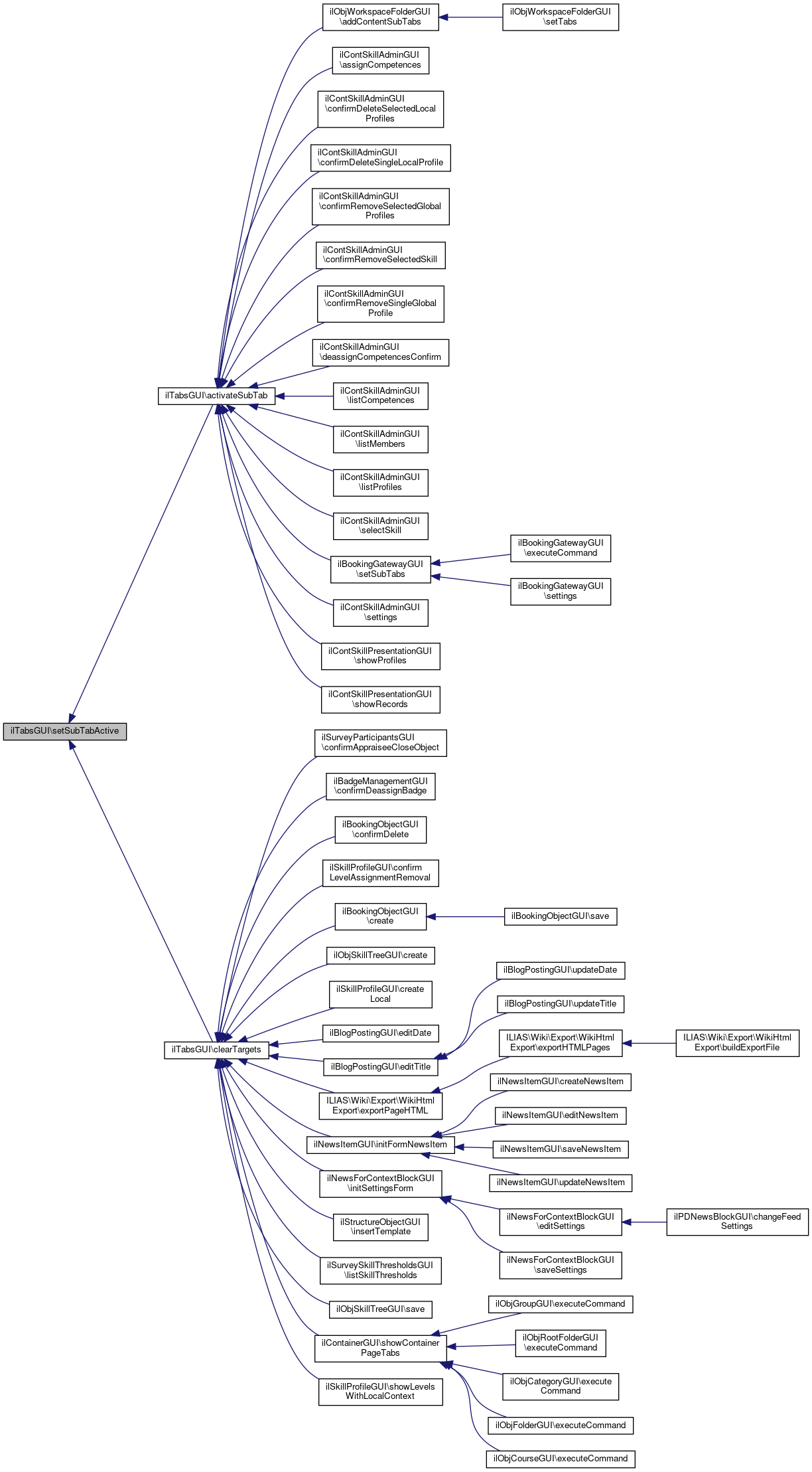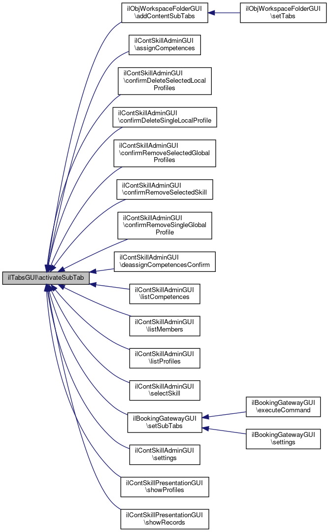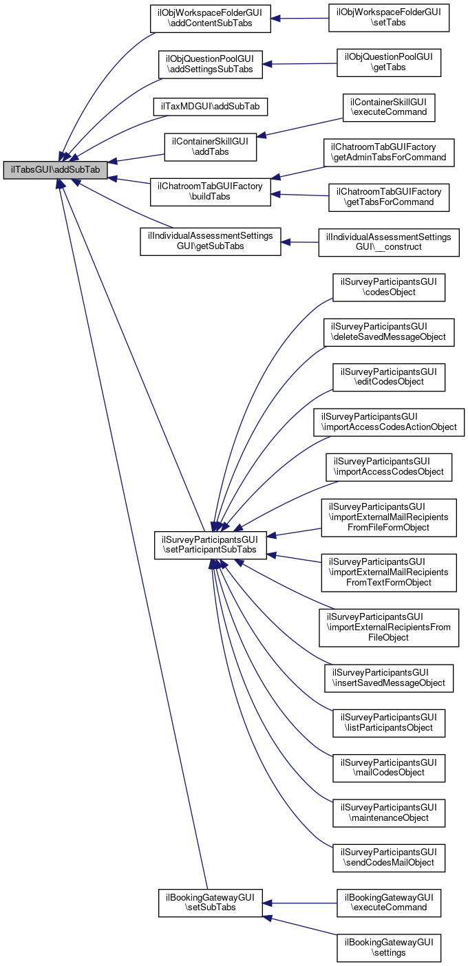 Referenced by ilObjWorkspaceFolderGUI\addContentSubTabs(), ilObjQuestionPoolGUI\addSettingsSubTabs(), ilTaxMDGUI\addSubTab(), ilContainerSkillGUI\addTabs(), ilChatroomTabGUIFactory\buildTabs(), ilIndividualAssessmentSettingsGUI\getSubTabs(), ilSurveyParticipantsGUI\setParticipantSubTabs(), and ilBookingGatewayGUI\setSubTabs().