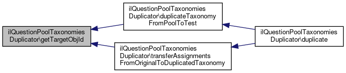 Here is the caller graph for this function:| ilQuestionPoolTaxonomiesDuplicator::getTargetObjId | ( | ) |