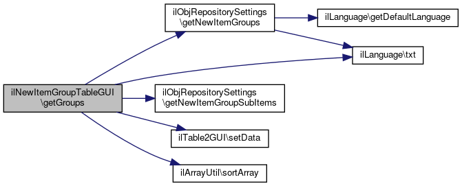 Here is the call graph for this function:| ilNewItemGroupTableGUI::getGroups | ( | ) |