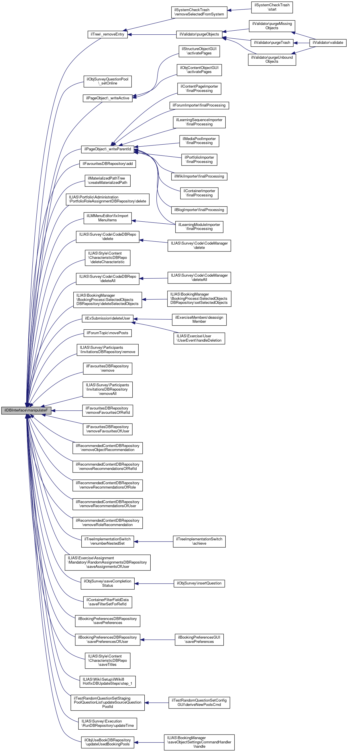 Referenced by ilTree\_removeEntry(), ilObjSurveyQuestionPool\_setOnline(), ilPageObject\_writeActive(), ilPageObject\_writeParentId(), ilFavouritesDBRepository\add(), ilMaterializedPathTree\createMaterializedPath(), ILIAS\Portfolio\Administration\PortfolioRoleAssignmentDBRepository\delete(), ILIAS\Survey\Code\CodeDBRepo\delete(), ILIAS\Survey\Code\CodeDBRepo\deleteAll(), ILIAS\Style\Content\CharacteristicDBRepo\deleteCharacteristic(), ILIAS\BookingManager\BookingProcess\SelectedObjectsDBRepository\deleteSelectedObjects(), ilExSubmission\deleteUser(), ilLMMenuEditor\fixImportMenuItems(), ilForumTopic\movePosts(), ILIAS\Survey\Participants\InvitationsDBRepository\remove(), ilFavouritesDBRepository\remove(), ILIAS\Survey\Participants\InvitationsDBRepository\removeAll(), ilFavouritesDBRepository\removeFavouritesOfRefId(), ilFavouritesDBRepository\removeFavouritesOfUser(), ilRecommendedContentDBRepository\removeObjectRecommendation(), ilRecommendedContentDBRepository\removeRecommendationsOfRefId(), ilRecommendedContentDBRepository\removeRecommendationsOfRole(), ilRecommendedContentDBRepository\removeRecommendationsOfUser(), ilRecommendedContentDBRepository\removeRoleRecommendation(), ilTreeImplementationSwitch\renumberNestedSet(), ILIAS\Exercise\Assignment\Mandatory\RandomAssignmentsDBRepository\saveAssignmentsOfUser(), ilObjSurvey\saveCompletionStatus(), ilContainerFilterFieldData\saveFilterSetForRefId(), ilBookingPreferencesDBRepository\savePreferences(), ilBookingPreferencesDBRepository\savePreferencesOfUser(), ILIAS\Style\Content\CharacteristicDBRepo\saveTitles(), ILIAS\Wiki\Setup\ilWiki8HotfixDBUpdateSteps\step_1(), ilTestRandomQuestionSetStagingPoolQuestionList\updateSourceQuestionPoolId(), ILIAS\Survey\Execution\RunDBRepository\updateTime(), and ilObjUseBookDBRepository\updateUsedBookingPools().