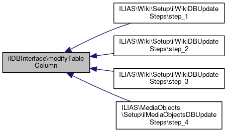 Here is the caller graph for this function:| ilDBInterface::modifyTableColumn | ( | string | $table, |