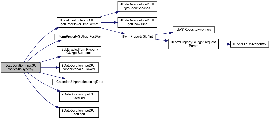 Here is the call graph for this function:| ilDateDurationInputGUI::setValueByArray | ( | array | $a_values | ) |