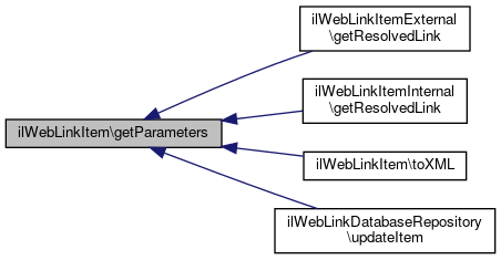 Here is the caller graph for this function:| ilWebLinkItem::getParameters | ( | ) |