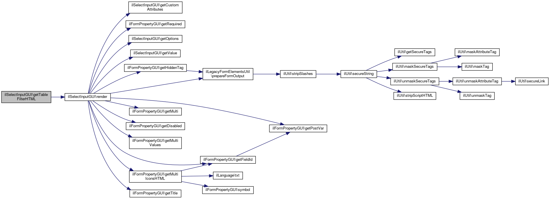 Here is the call graph for this function:| ilSelectInputGUI::getTableFilterHTML | ( | ) |