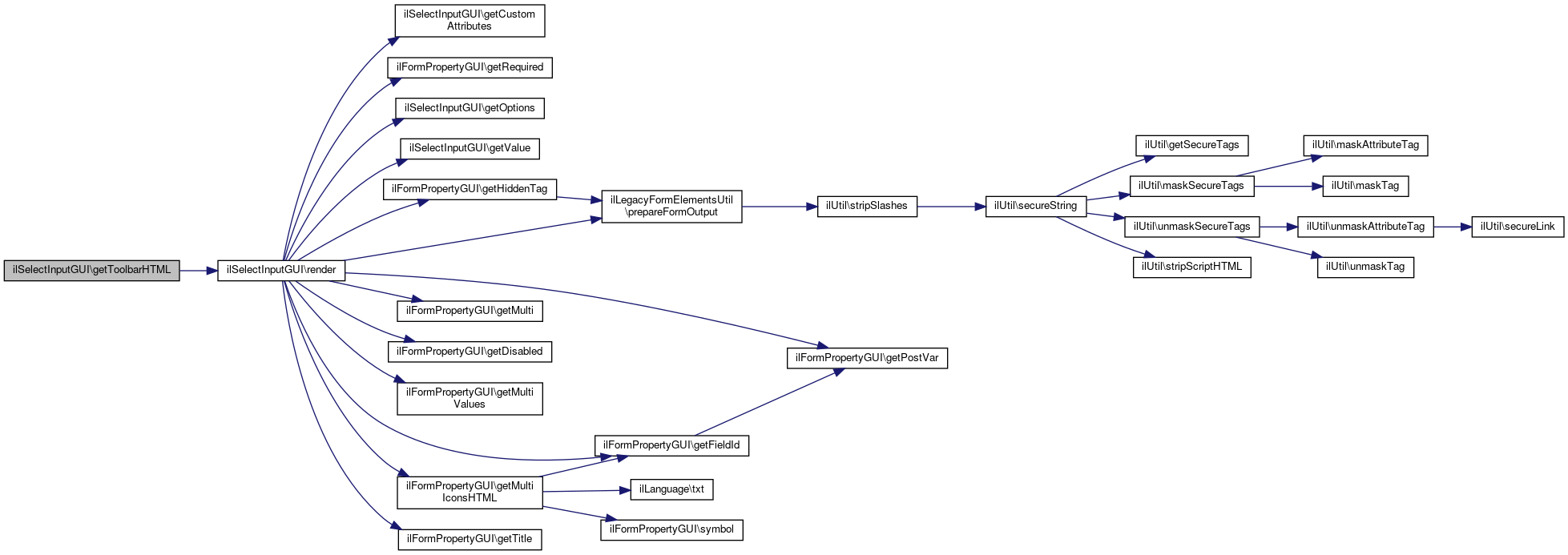 Here is the call graph for this function:| ilSelectInputGUI::getToolbarHTML | ( | ) |