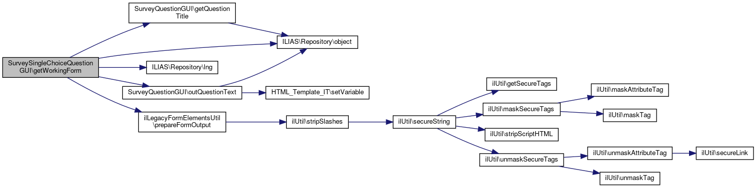 Here is the call graph for this function:| SurveySingleChoiceQuestionGUI::getWorkingForm | ( | array | $working_data = null,  |