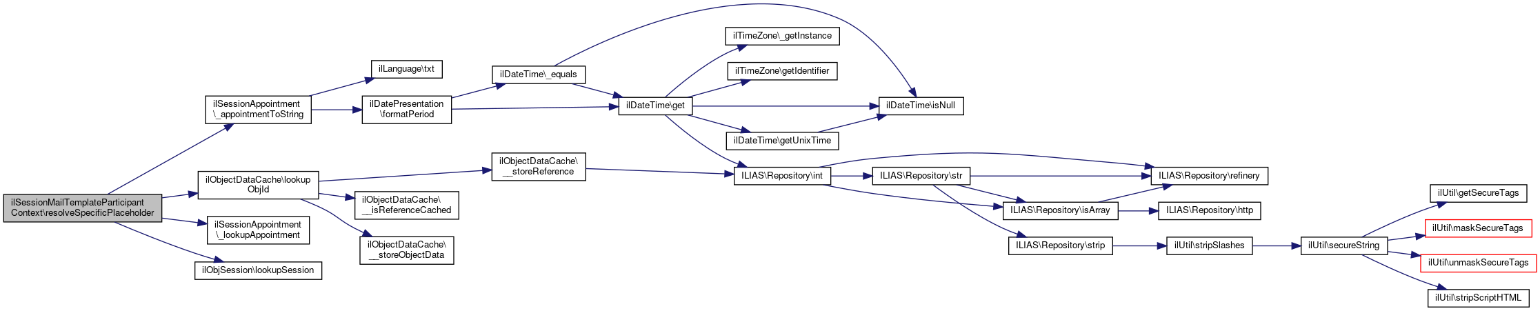 Here is the call graph for this function:| ilSessionMailTemplateParticipantContext::resolveSpecificPlaceholder | ( | string | $placeholder_id, |