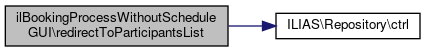Here is the caller graph for this function:| ilBookingProcessWithoutScheduleGUI::redirectToParticipantsList | ( | ) |