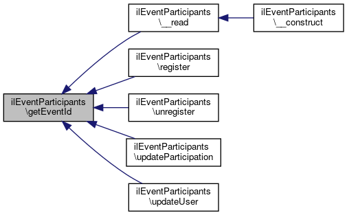 Here is the call graph for this function:| ilEventParticipants::setEventId | ( | int | $a_event_id | ) |