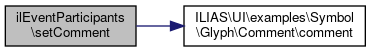 Here is the call graph for this function:| ilEventParticipants::setComment | ( | string | $a_comment | ) |