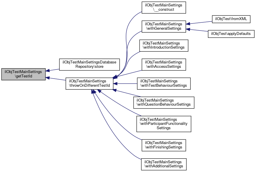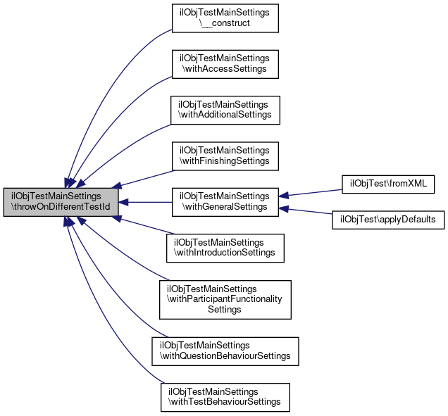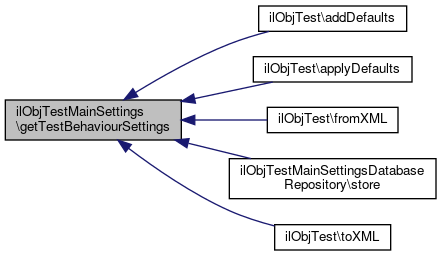 Here is the call graph for this function:| ilObjTestMainSettings::withTestBehaviourSettings | ( | ilObjTestSettingsTestBehaviour | $settings | ) |
