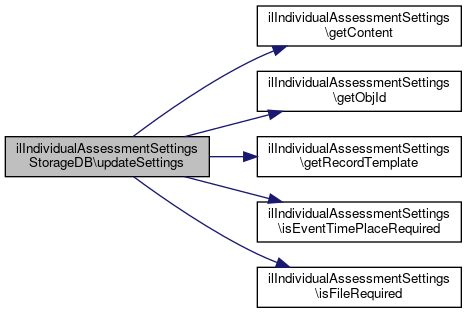 Here is the call graph for this function:| ilIndividualAssessmentSettingsStorageDB::updateSettings | ( | ilIndividualAssessmentSettings | $settings | ) |