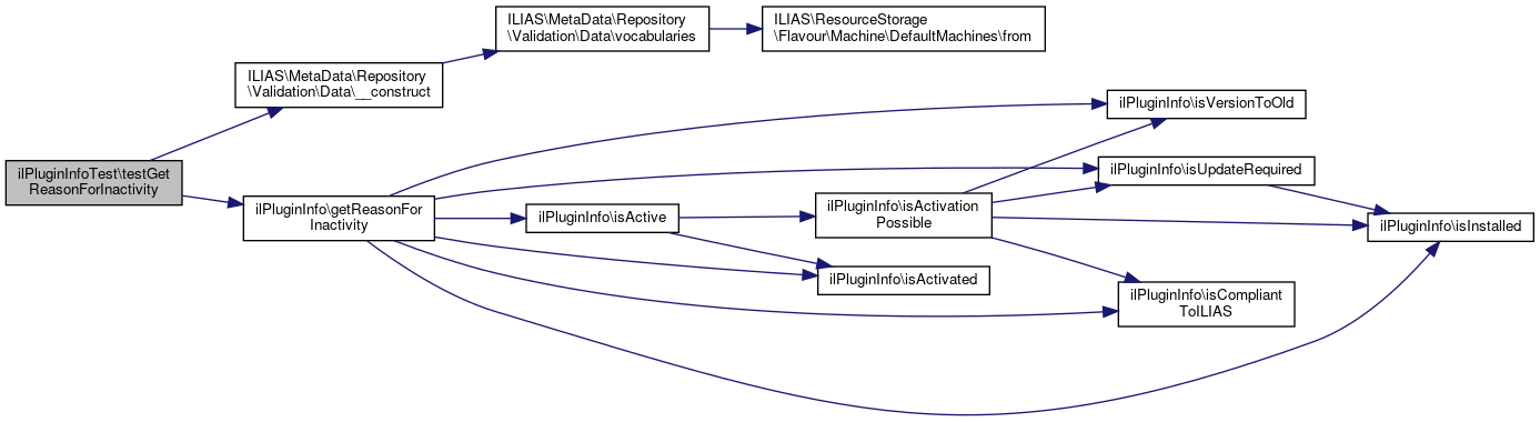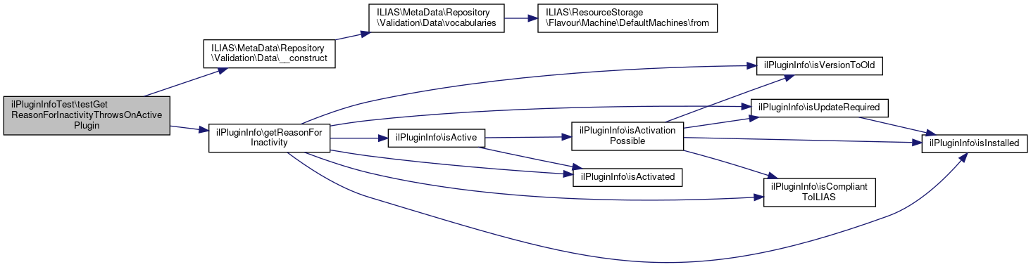 Here is the call graph for this function:| ilPluginInfoTest::testGetReasonForInactivityThrowsOnActivePlugin | ( | ) |