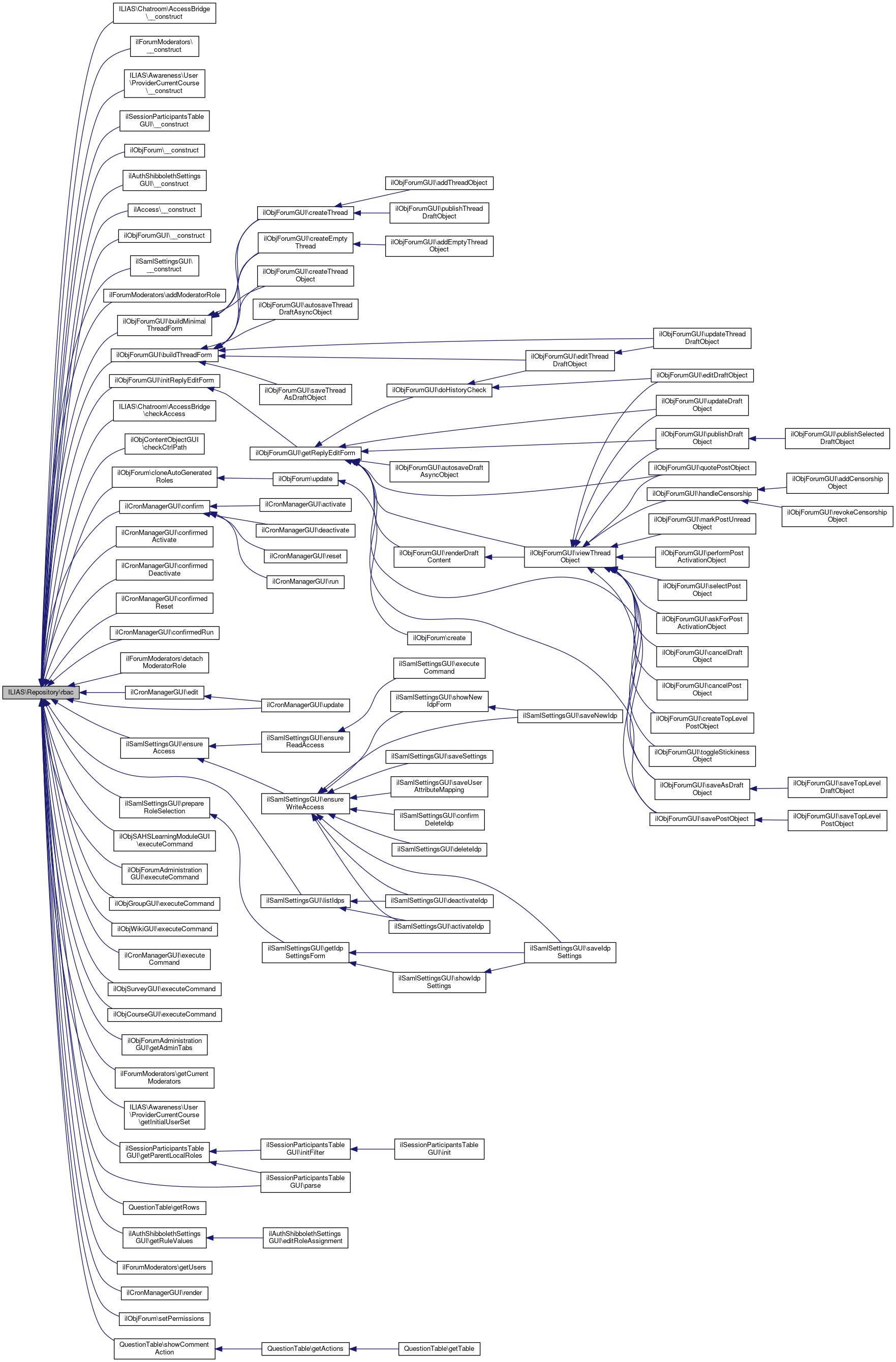Referenced by ILIAS\Chatroom\AccessBridge\__construct(), ilForumModerators\__construct(), ILIAS\Awareness\User\ProviderCurrentCourse\__construct(), ilSessionParticipantsTableGUI\__construct(), ilObjForum\__construct(), ilAuthShibbolethSettingsGUI\__construct(), ilAccess\__construct(), ilObjForumGUI\__construct(), ilSamlSettingsGUI\__construct(), ilForumModerators\addModeratorRole(), ilObjForumGUI\buildMinimalThreadForm(), ilObjForumGUI\buildThreadForm(), ILIAS\Chatroom\AccessBridge\checkAccess(), ilObjContentObjectGUI\checkCtrlPath(), ilObjForum\cloneAutoGeneratedRoles(), ilCronManagerGUI\confirm(), ilCronManagerGUI\confirmedActivate(), ilCronManagerGUI\confirmedDeactivate(), ilCronManagerGUI\confirmedReset(), ilCronManagerGUI\confirmedRun(), ilForumModerators\detachModeratorRole(), ilCronManagerGUI\edit(), ilSamlSettingsGUI\ensureAccess(), ilObjSAHSLearningModuleGUI\executeCommand(), ilObjForumAdministrationGUI\executeCommand(), ilObjGroupGUI\executeCommand(), ilObjWikiGUI\executeCommand(), ilCronManagerGUI\executeCommand(), ilObjSurveyGUI\executeCommand(), ilObjCourseGUI\executeCommand(), ilObjForumAdministrationGUI\getAdminTabs(), ilForumModerators\getCurrentModerators(), ILIAS\Awareness\User\ProviderCurrentCourse\getInitialUserSet(), ilSessionParticipantsTableGUI\getParentLocalRoles(), QuestionTable\getRows(), ilAuthShibbolethSettingsGUI\getRuleValues(), ilForumModerators\getUsers(), ilObjForumGUI\initReplyEditForm(), ilSamlSettingsGUI\listIdps(), ilSessionParticipantsTableGUI\parse(), ilSamlSettingsGUI\prepareRoleSelection(), ilCronManagerGUI\render(), ilObjForum\setPermissions(), QuestionTable\showCommentAction(), and ilCronManagerGUI\update().