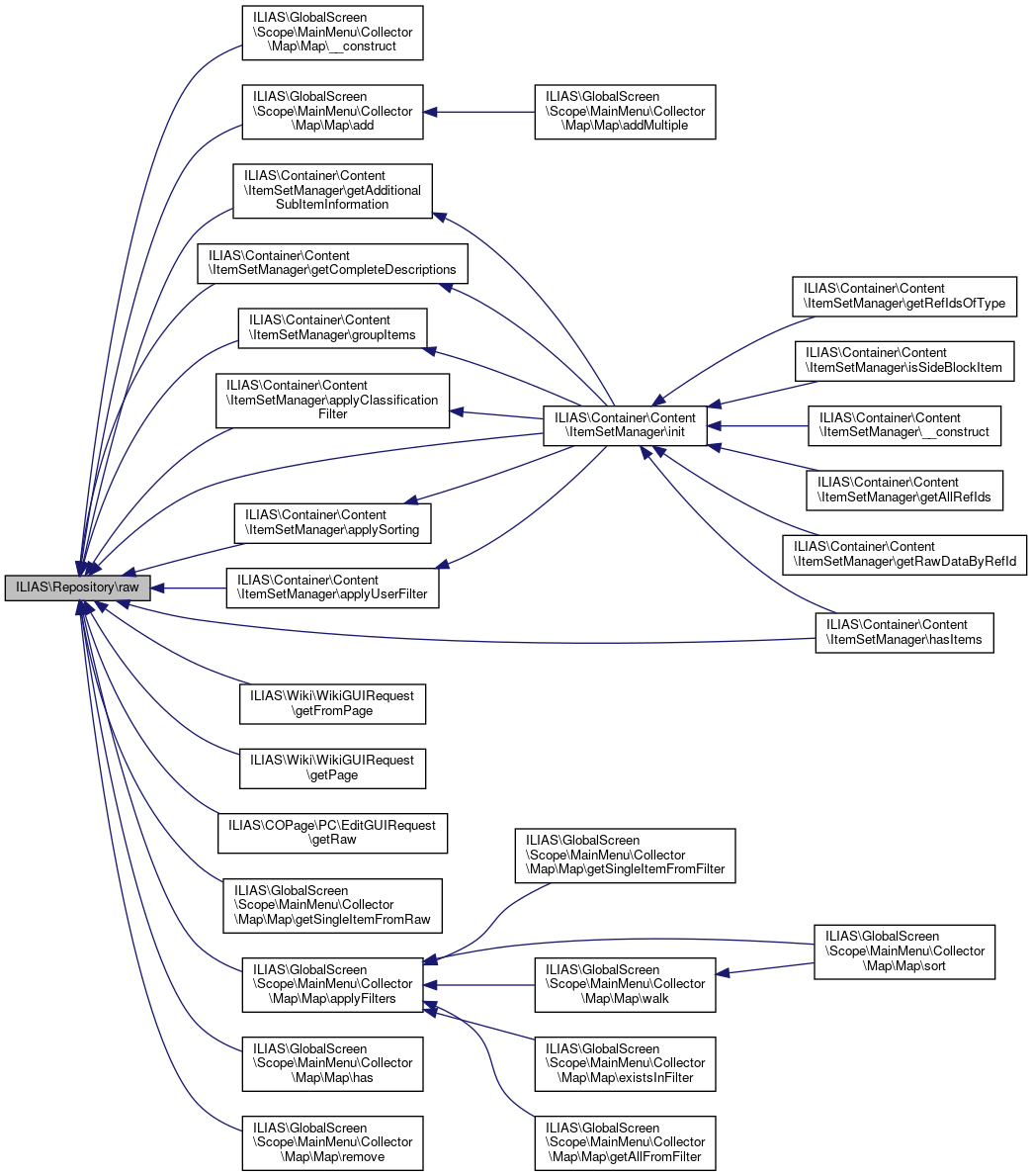 Referenced by ILIAS\GlobalScreen\Scope\MainMenu\Collector\Map\Map\__construct(), ILIAS\GlobalScreen\Scope\MainMenu\Collector\Map\Map\add(), ILIAS\Container\Content\ItemSetManager\applyClassificationFilter(), ILIAS\GlobalScreen\Scope\MainMenu\Collector\Map\Map\applyFilters(), ILIAS\Container\Content\ItemSetManager\applySorting(), ILIAS\Container\Content\ItemSetManager\applyUserFilter(), ILIAS\Container\Content\ItemSetManager\getAdditionalSubItemInformation(), ILIAS\Container\Content\ItemSetManager\getCompleteDescriptions(), ILIAS\Wiki\WikiGUIRequest\getFromPage(), ILIAS\Wiki\WikiGUIRequest\getPage(), ILIAS\COPage\PC\EditGUIRequest\getRaw(), ILIAS\GlobalScreen\Scope\MainMenu\Collector\Map\Map\getSingleItemFromRaw(), ILIAS\Container\Content\ItemSetManager\groupItems(), ILIAS\GlobalScreen\Scope\MainMenu\Collector\Map\Map\has(), ILIAS\Container\Content\ItemSetManager\hasItems(), ILIAS\Container\Content\ItemSetManager\init(), and ILIAS\GlobalScreen\Scope\MainMenu\Collector\Map\Map\remove().