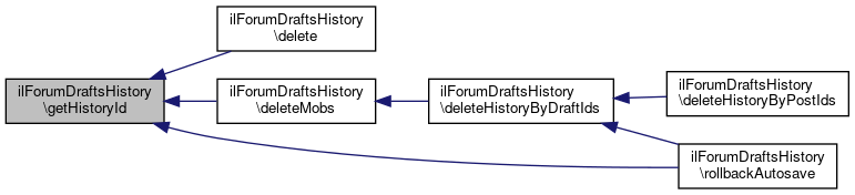 Here is the call graph for this function:| ilForumDraftsHistory::getHistoryId | ( | ) |