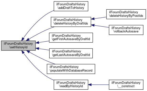 Here is the caller graph for this function:| ilForumDraftsHistory::setHistoryId | ( | int | $history_id | ) |