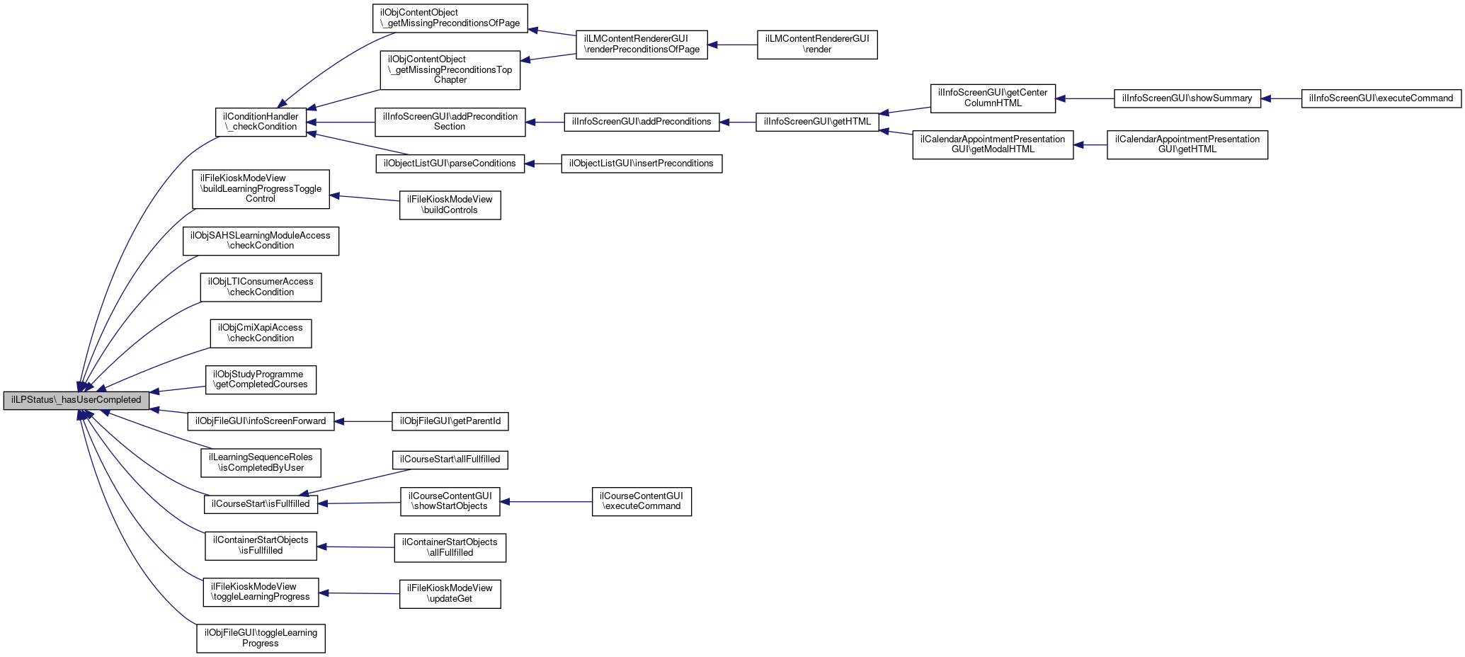 Referenced by ilConditionHandler\_checkCondition(), ilFileKioskModeView\buildLearningProgressToggleControl(), ilObjSAHSLearningModuleAccess\checkCondition(), ilObjLTIConsumerAccess\checkCondition(), ilObjCmiXapiAccess\checkCondition(), ilObjStudyProgramme\getCompletedCourses(), ilObjFileGUI\infoScreenForward(), ilLearningSequenceRoles\isCompletedByUser(), ilCourseStart\isFullfilled(), ilContainerStartObjects\isFullfilled(), ilFileKioskModeView\toggleLearningProgress(), and ilObjFileGUI\toggleLearningProgress().