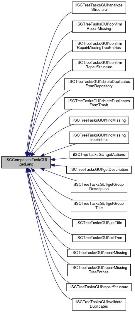 Referenced by ilSCTreeTasksGUI\analyzeStructure(), ilSCTreeTasksGUI\confirmRepairMissing(), ilSCTreeTasksGUI\confirmRepairMissingTreeEntries(), ilSCTreeTasksGUI\confirmRepairStructure(), ilSCTreeTasksGUI\deleteDuplicatesFromRepository(), ilSCTreeTasksGUI\deleteDuplicatesFromTrash(), ilSCTreeTasksGUI\findMissing(), ilSCTreeTasksGUI\findMissingTreeEntries(), ilSCTreeTasksGUI\getActions(), ilSCTreeTasksGUI\getDescription(), ilSCTreeTasksGUI\getGroupDescription(), ilSCTreeTasksGUI\getGroupTitle(), ilSCTreeTasksGUI\getTitle(), ilSCTreeTasksGUI\listTree(), ilSCTreeTasksGUI\repairMissing(), ilSCTreeTasksGUI\repairMissingTreeEntries(), ilSCTreeTasksGUI\repairStructure(), and ilSCTreeTasksGUI\validateDuplicates().