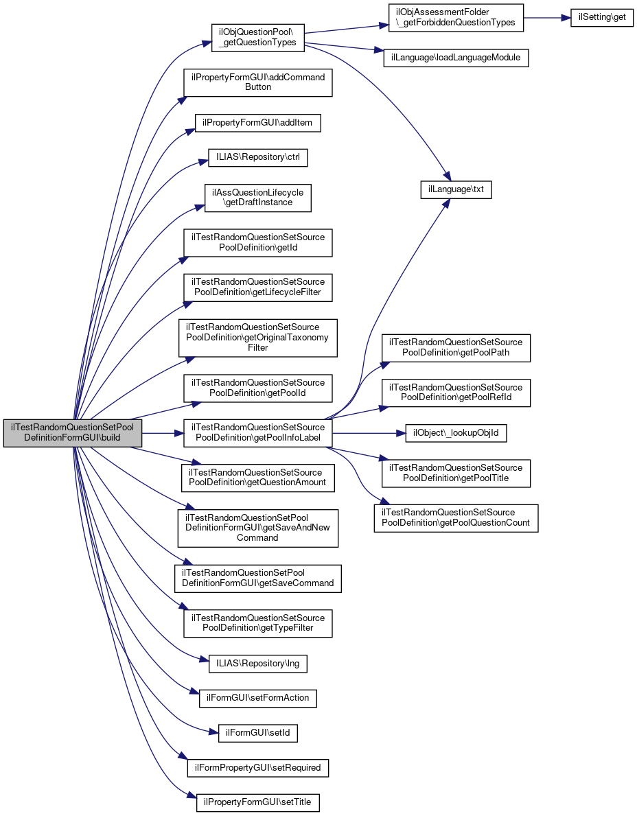 Here is the call graph for this function:| ilTestRandomQuestionSetPoolDefinitionFormGUI::build | ( | ilTestRandomQuestionSetSourcePoolDefinition | $sourcePool, |