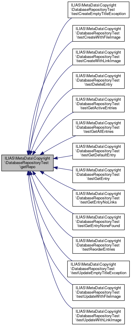 Referenced by ILIAS\MetaData\Copyright\DatabaseRepositoryTest\testCreateEmptyTitleException(), ILIAS\MetaData\Copyright\DatabaseRepositoryTest\testCreateWithFileImage(), ILIAS\MetaData\Copyright\DatabaseRepositoryTest\testCreateWithLinkImage(), ILIAS\MetaData\Copyright\DatabaseRepositoryTest\testDeleteEntry(), ILIAS\MetaData\Copyright\DatabaseRepositoryTest\testGetActiveEntries(), ILIAS\MetaData\Copyright\DatabaseRepositoryTest\testGetAllEntries(), ILIAS\MetaData\Copyright\DatabaseRepositoryTest\testGetDefaultEntry(), ILIAS\MetaData\Copyright\DatabaseRepositoryTest\testGetEntry(), ILIAS\MetaData\Copyright\DatabaseRepositoryTest\testGetEntryNoLinks(), ILIAS\MetaData\Copyright\DatabaseRepositoryTest\testGetEntryNoneFound(), ILIAS\MetaData\Copyright\DatabaseRepositoryTest\testReorderEntries(), ILIAS\MetaData\Copyright\DatabaseRepositoryTest\testUpdateEmptyTitleException(), ILIAS\MetaData\Copyright\DatabaseRepositoryTest\testUpdateWithFileImage(), and ILIAS\MetaData\Copyright\DatabaseRepositoryTest\testUpdateWithLinkImage().